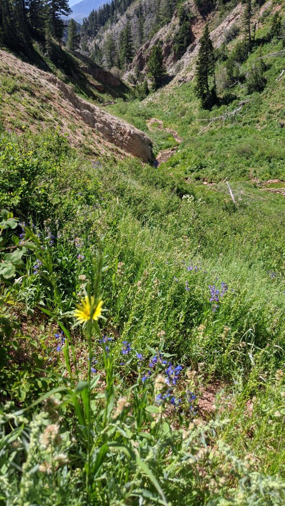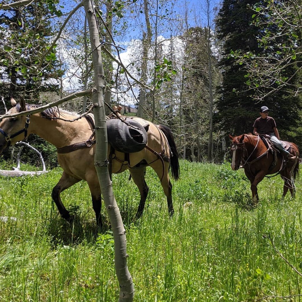 He and 3 generations of his family were on the mountain placing 400+ lbs of salt lick blocks in the meadows for the health of his cattle.The horses with the rubber tire saddlebags carry 4x 50 lbs blocks of salt The cows are currently grazing lower on the mountain and are gradually grazing there way up to this higher ground. He has lost cows to injury, illness and even wildfires. The rain storm we had a few weeks back helped to grow the grass on the mountain. Another big soaking rain storm would further bolster the volume of grass for grazing. One year, he told me, two of his cows wandered on a narrow hiking trail over a saddle on the Nebo ridge and were found by other rancher in the town of Mona 5,000+ vertical feet down the other side of the mountain.
