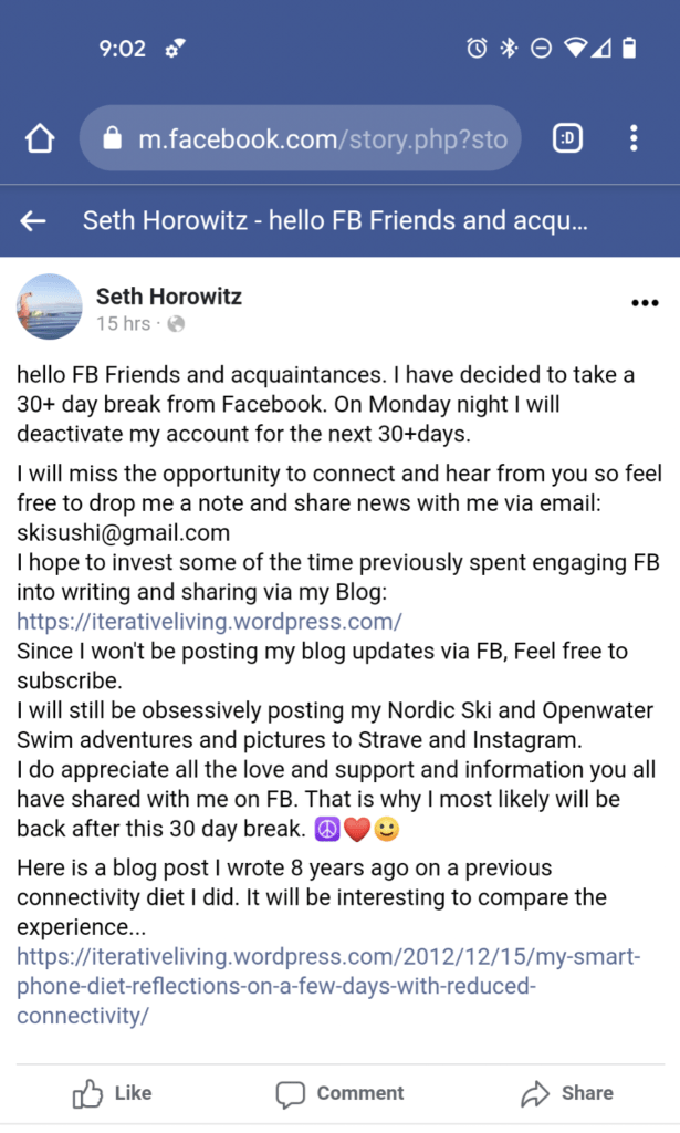 I will miss the opportunity to connect and hear from you so feel free to drop me a note and share news with me via email: skisushi@gmail.com I hope to invest some of the time previously spent engaging FB into writing and sharing via my Blog: https://iterativeliving.wordpress.com/ Since I won’t be posting my blog updates via FB, Feel free to subscribe. I will still be obsessively posting my Nordic Ski and Openwater Swim adventures and pictures to Strave and Instagram. I do appreciate all the love and support and information you all have shared with me on FB. That is why I most likely will be back after this 30 day break. ☮❤🙂
