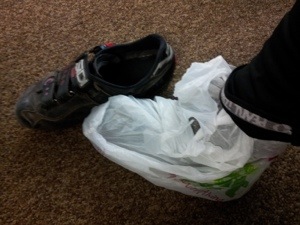 This morning I was staring at the outside thermometer trying to motivate myself to ride to work……My wife challenged me with the statement “aren’t you a New Yorker?…I thought you were tough!” So, I steeled myself with the resolve for the chilliest bicycling commute of the year. I prepared with smart layering and an appropriate amount of insulation and wind protection. On cold days even with neoprene booties I find my toes are the one part of my body that I struggle to keep warm. Looking for a solution to this problem, I decided to experiment to find a solution to this “cold toe” problem. In addition to warm socks and neoprene booties, I decided I needed one more layer to trap the heat near my toes. Thinking back to my youth I decided to try a trick we used when I was little. Over my socks I wrapped a plastic garbage bag to trap in the heat.